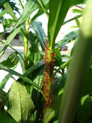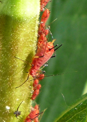 「今のうちに刈らないとドえらい事になるのよね・・・」と昨年の物凄い高さのセイタカアワダチソウを思い出しながら、なんともなしに眺めていると、どの茎にも真っ赤な何かがミッチリと蠢いているのです。。。